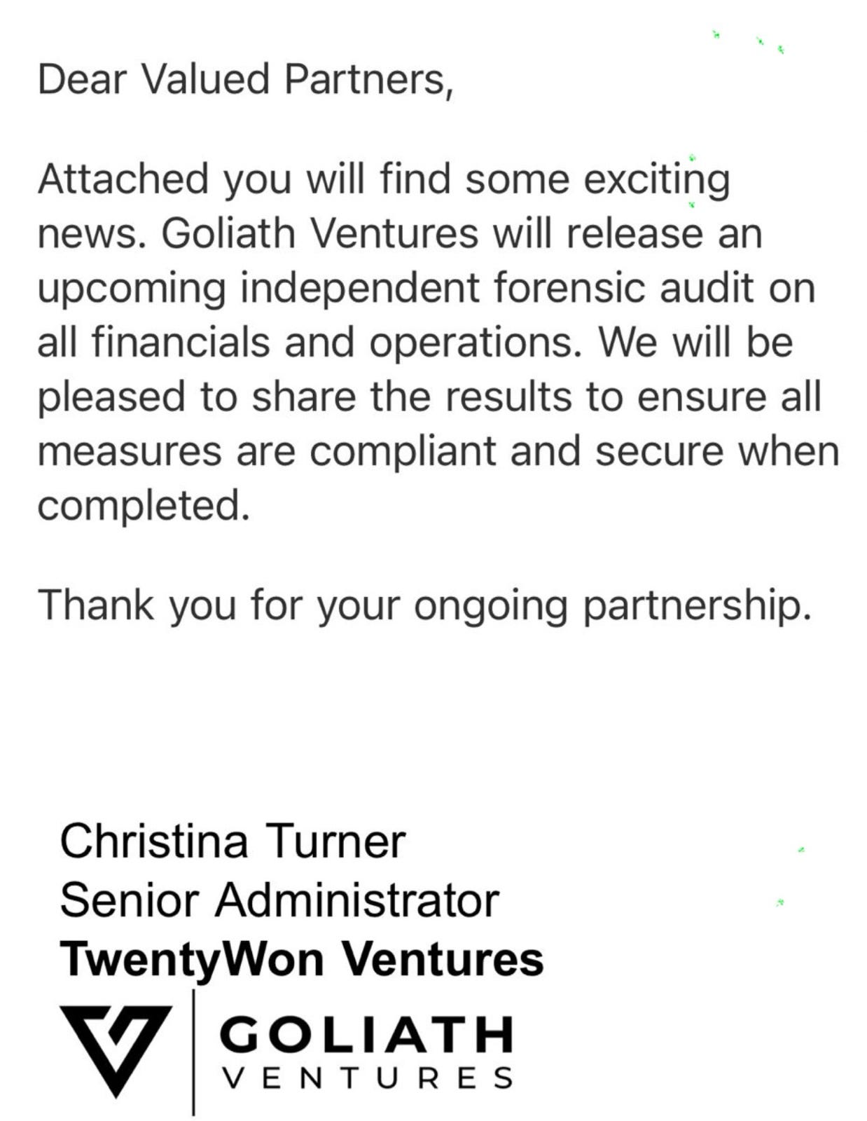 Attached you will find some exciting news. Goliath Ventures will release an upcoming independent forensic audit on all financials and operations. We will be pleased to share the results to ensure all measures are compliant and secure when completed. Thank you for your ongoing partnership.